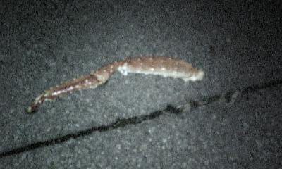 家の約20メートル手前の道路上に中身の詰まったタラバガニの脚が落ちていたので